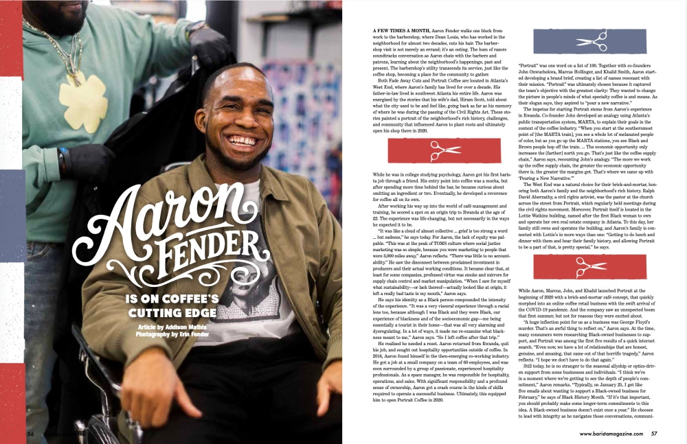 Aaron Fender is on Coffee's Cutting Edge. Portrait Coffee in Atlanta, Ga. is Aaron Fender's labor of love to his community. Aaron's shop in Atlanta's West End is a continuation of his family's legacy in the area and his work is a chance to build on that legacy while supporting his neighborhood.
